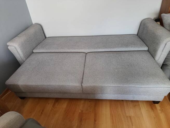 Sprzedam kanapę rozkładana popielatą z pojemnikiem na pościel prawie nową z dwoma poduchami o wym. Dług.220 cm, szer.po ...